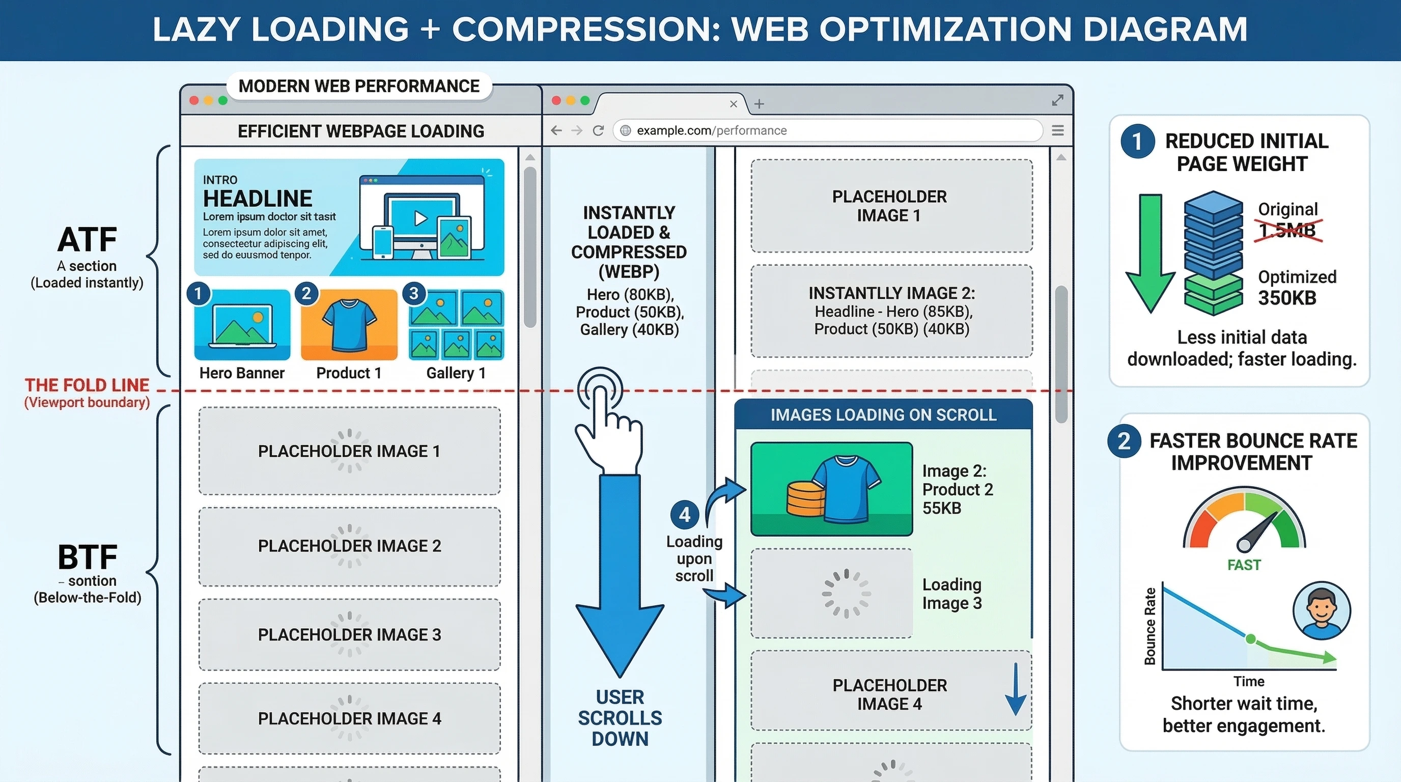 The mechanism is simple: smaller images mean less data transfer. On mobile (where bounce sensitivity peaks), this translates to users actually seeing content before frustration sets in. Combine it with lazy loading (images load only when scrolled into view), and you compound the gains. In my tests, sites hitting under 2-second loads often see bounce rates dip below 45%—a solid benchmark for most niches.